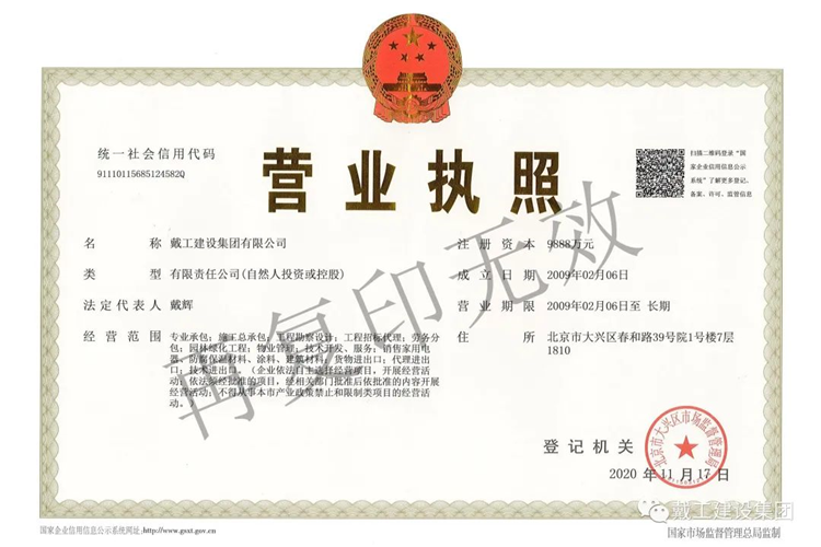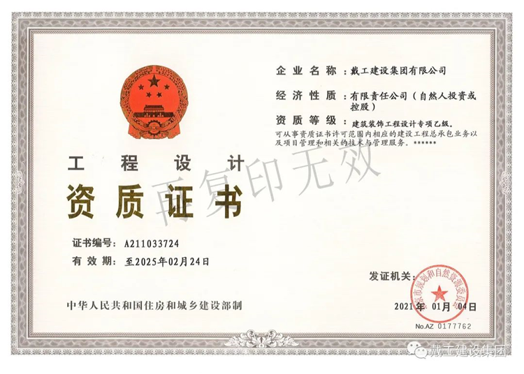 戴工建設集團有限公司系一家集裝飾設計、工程施工、材料配送、木門、地板、家具、 裝飾品開發為一體的裝飾企業。公司位于北京市大興區。具有建委頒發的建筑裝飾裝修專業 壹級、防水保溫工程專業壹級、建筑幕墻專業貳級、消防設施專業貳級、電子與智能化專業 貳級,特種工程(結構補強)專業不分等級、建筑機電安裝專業叁級、環保工程專業叁級、 鋼結構專業叁級、建筑工程總承包叁級、建筑裝飾工程設計專項乙級、中國展覽館協會展覽 陳列工程設計與施工一體化壹級資質和中國展覽館協會展覽工程企業資質。公司通過了GB/T19001,IS014001,GB/T/OHSAS 認證。主要從事辦公空間、餐飲酒店、商業空間、學校、 醫院、別墅、住宅等場所的裝修設計和施工。公司經北京市工商管理局正式批準注冊、北京市建委審核認定,已取得國家正規資質, 為中國建筑裝飾協會、中國室內裝飾協會、北京室內裝飾協會、北京市建筑裝飾協會的會員 單位,誠信五星級單位、質量 AAA 級單位。多年來公司持續穩步發展,下設財務部、綜合管理部、工程質量部、市場開發部、經營 部、設計部和合同預算部七個部門。建立了從方案設計、工程施工、質量監督到售后服務等 一整套細致合理的服務流程體系。由經驗豐富、時尚創新的設計精英;正規培訓、技藝嫻熟 的南方技工;資深專業的管理人員共同組建成一支誠信、敬業、務實、創新的精英團隊。先 進的辦公及施工、檢測設備;人文、科學的企業管理模式,為工程質量和公司發展提供了有 力的保障。公司以先進的設計理念、精深的設計功底為先導,以規范的管理、精湛的施工技術為基 礎,以完善的服務體系為依托,以產業化模式經營降低成本為優勢,為客戶提供專業化、人 性化、個性化的裝修產品和服務,并不懈努力以提升和超越客戶的消費價值。面對激烈的市場競爭,公司全體員工一直秉承“以質量求生存,以服務求發展”的經營 理念,“客戶的滿意是我們工作的唯一標準”,始終堅持以客戶的需求和滿意為核心,從而使 公司不斷發展壯大,并贏得了較大的市場份額,成為裝飾行業中的佼佼者。公司將一如既往的致力于為社會各界提供更完善、更完美的裝修服務,精心鑄造“戴工” 品牌!并愿與業界同仁攜手,共建行業自律,維護市場環境,樹立行業新風,推動行業發展, 引領裝修新潮流,構建和諧社會之和諧裝修新篇章!