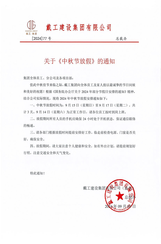 在此,戴工集團再次向全體員工及家人致以最誠摯的中秋祝福!愿大家在這個團圓的日子里與家人共度美好時光,同時也期待大家以更加飽滿的熱情和充沛的精力投入到后續的工作中,共同推動公司的發展邁上新的臺階!